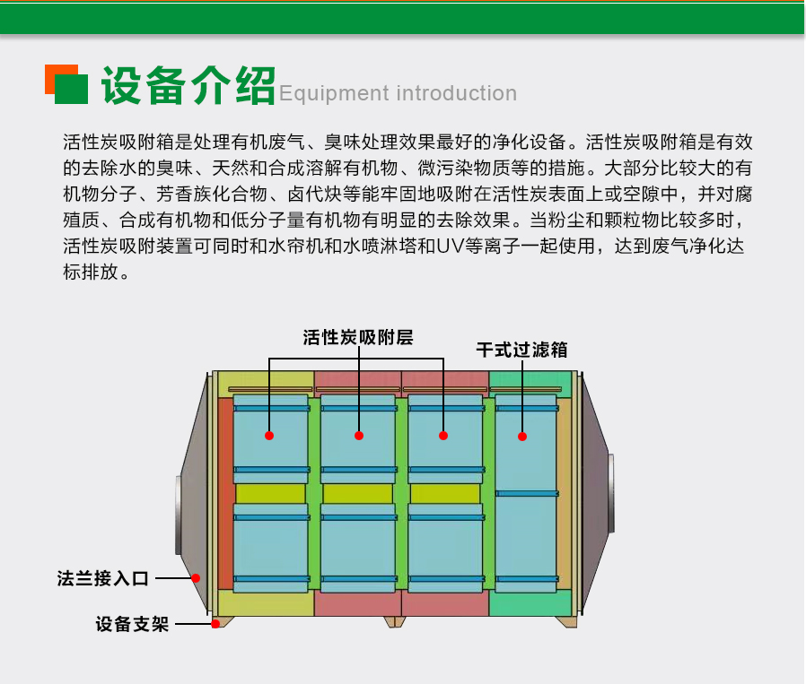 活性炭吸附裝置整體可采用PP、不銹鋼、鐵等材料制成,采用抽屜式的加炭方式,操作方便,占地面積小,安裝好即可使用,無(wú)需人工看管,做好清洗與換炭工作即可。