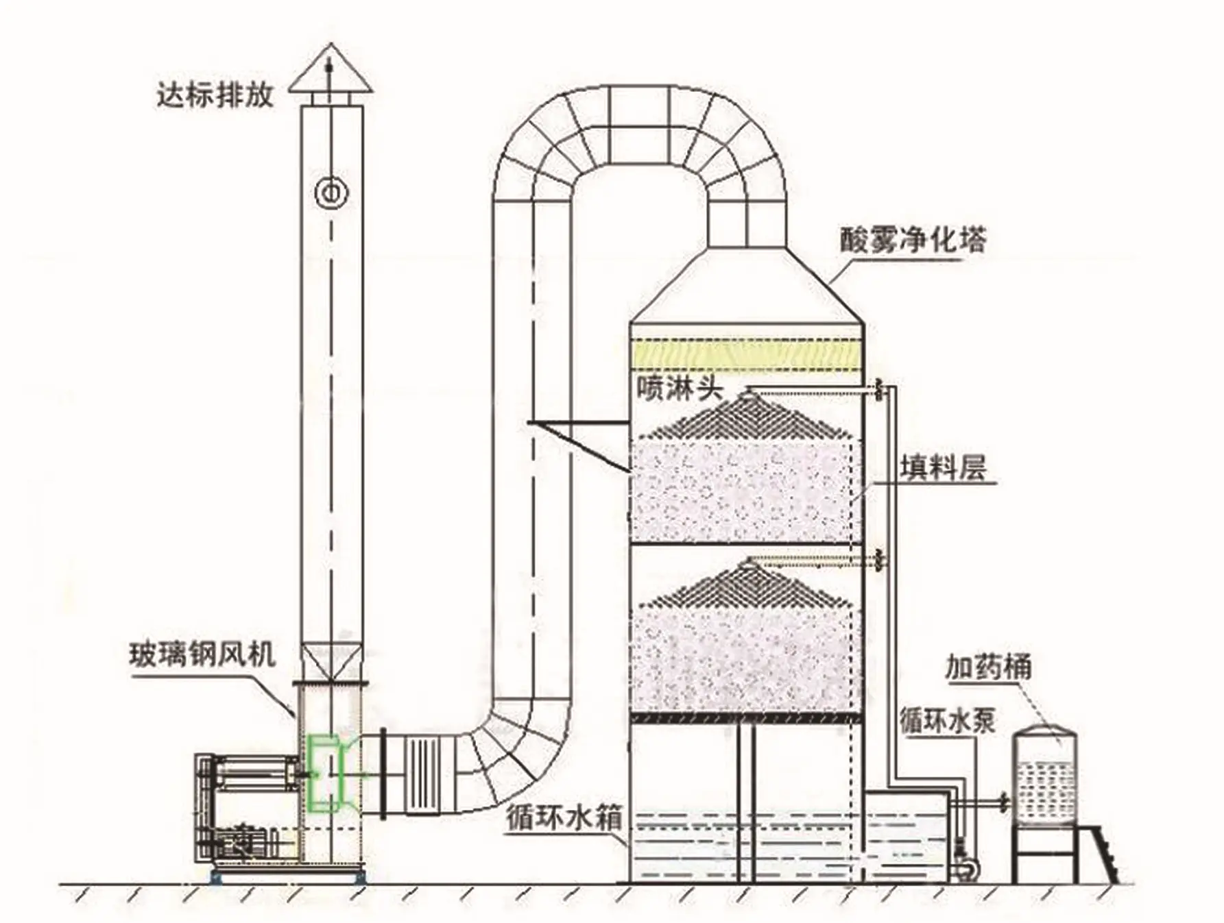噴淋塔為實(shí)施噴淋法治理廢氣或回收原料的重要組成設(shè)備,故又稱(chēng)為水洗塔、洗滌塔、凈化塔。根據(jù)廢氣類(lèi)別及噴淋液的不同可分為水噴淋塔、酸噴淋塔、堿噴淋塔、油噴淋塔、水膜除塵/濕式除塵器;按形狀也可分為立式洗滌塔、臥式洗滌塔;按材質(zhì)又為分PP洗滌塔、玻璃鋼洗滌塔等。 噴淋塔運(yùn)行方式是不斷將酸霧廢氣由風(fēng)管引入凈化塔,將廢氣與氫氧化鈉吸收液進(jìn)行充分接觸吸收中和反應(yīng),酸霧廢氣經(jīng)過(guò)凈化后,再經(jīng)除霧板脫水除霧后由風(fēng)機(jī)排入大氣。吸收液在塔底經(jīng)水泵增壓后在塔頂噴淋而下,之后回流至塔底水箱內(nèi)如此進(jìn)行循環(huán)使用。凈化后的酸霧廢氣可以達(dá)到地方排放標(biāo)準(zhǔn)的排放要求,也會(huì)低于國(guó)家排放標(biāo)準(zhǔn)。