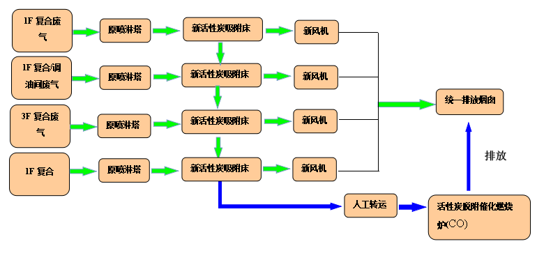 目前該公司在各車(chē)間根據(jù)不同的生產(chǎn)工藝分類(lèi)收集廢氣匯入主風(fēng)管,主風(fēng)管接入指定廠房排風(fēng)井,經(jīng)風(fēng)井在離心風(fēng)機(jī)的牽引作用下引入屋面廢氣治理設(shè)施,對(duì)于低濃度廢氣采用的是水噴淋吸收法,對(duì)于高濃度廢氣采用的是水噴淋吸收+活性炭吸附法,該公司為響應(yīng)環(huán)保要求,擬對(duì)廢氣處理設(shè)施提標(biāo)改造。