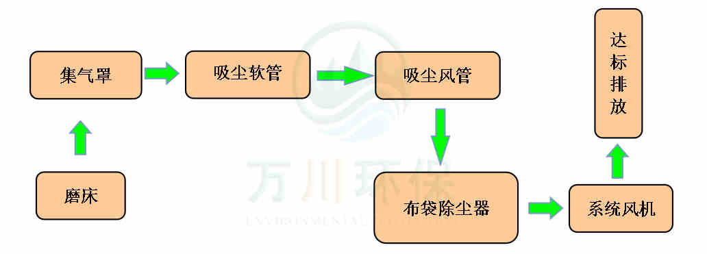 磨床生產(chǎn)時(shí)產(chǎn)生的粉塵通過(guò)集氣罩、吸塵軟管進(jìn)入到脈沖布袋除塵器中過(guò)濾凈化,粉塵落入灰斗,凈化后的廢氣通過(guò)系統(tǒng)風(fēng)機(jī)達(dá)標(biāo)排放。