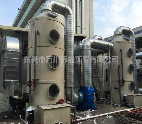 噴淋塔也叫水淋塔,是以水為介質處理粉塵。含塵氣體從塔體下方進氣口沿切向進入噴淋塔,在風機的作用下,迅速充滿進氣段空間,然后塔頂位置的噴淋頭向下噴水,水與含塵廢氣接觸,使得空氣和粉塵分離,達到除塵的效果。噴淋塔具有結構簡單、造價低、占地面積小、凈化效率高等優(yōu)點,能夠處理高溫、高濕的氣流,將著火、爆炸的可能減至最低。經治理后,污染物排放達到標準:執(zhí)行《廣東省大氣污染物排放標準》(DB44/27-2001)中第二時段一級標準。